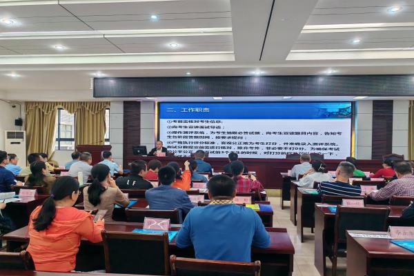 为确保考试的顺利进行,学院继续教育部以“平安平稳、规范有序”为宗旨,制定了《2024年下半年海南省中小学教师资格考试面试海南政法职业学院考点工作方案》,成立组织领导机构,以学院院长陈文彬为组长,院内相关职能部门负责人为成员。在开考前,继续教育部组织召开了考务人员培训会和面试考官培训会,分别对候考、抽题、引导、备课、监督、外围、技术、食宿、医疗、保密、突发事件应对等工作作了详细要求和职责解读。继续教育部主任刘志博,信息中心副教授郭毅、何铮分别对66名面试考官进行工作职责、工作守则、操作流程、评分细则和注意事项等方面的培训,确保面试的公正性和客观性,并开展面试流程演练,为面试工作顺利开展打下坚实的基础。